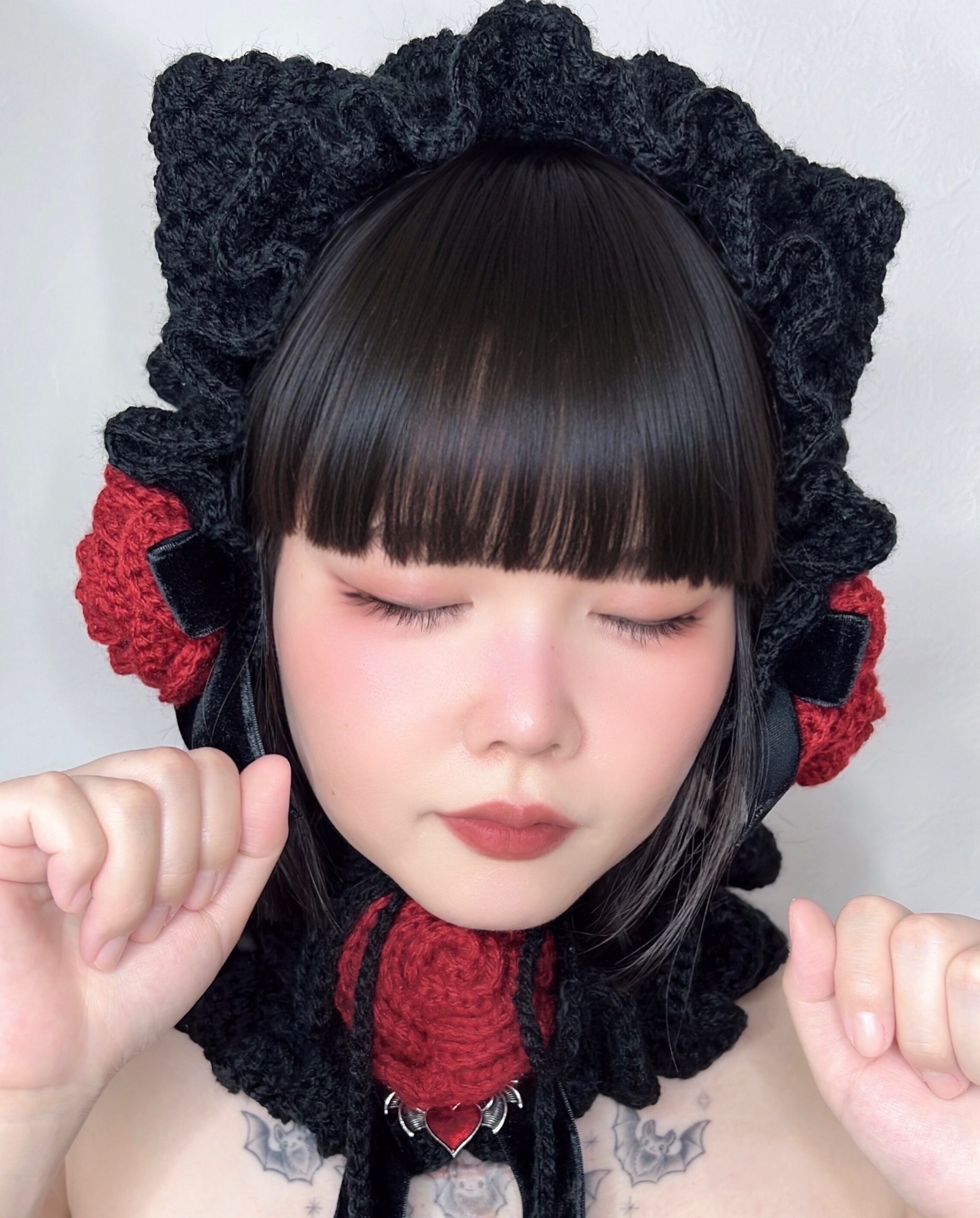 黒猫の耳をあしらい、毛糸でたっぷりとフリルを表現しました。