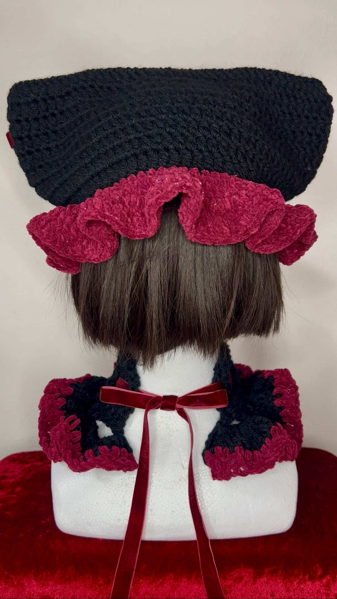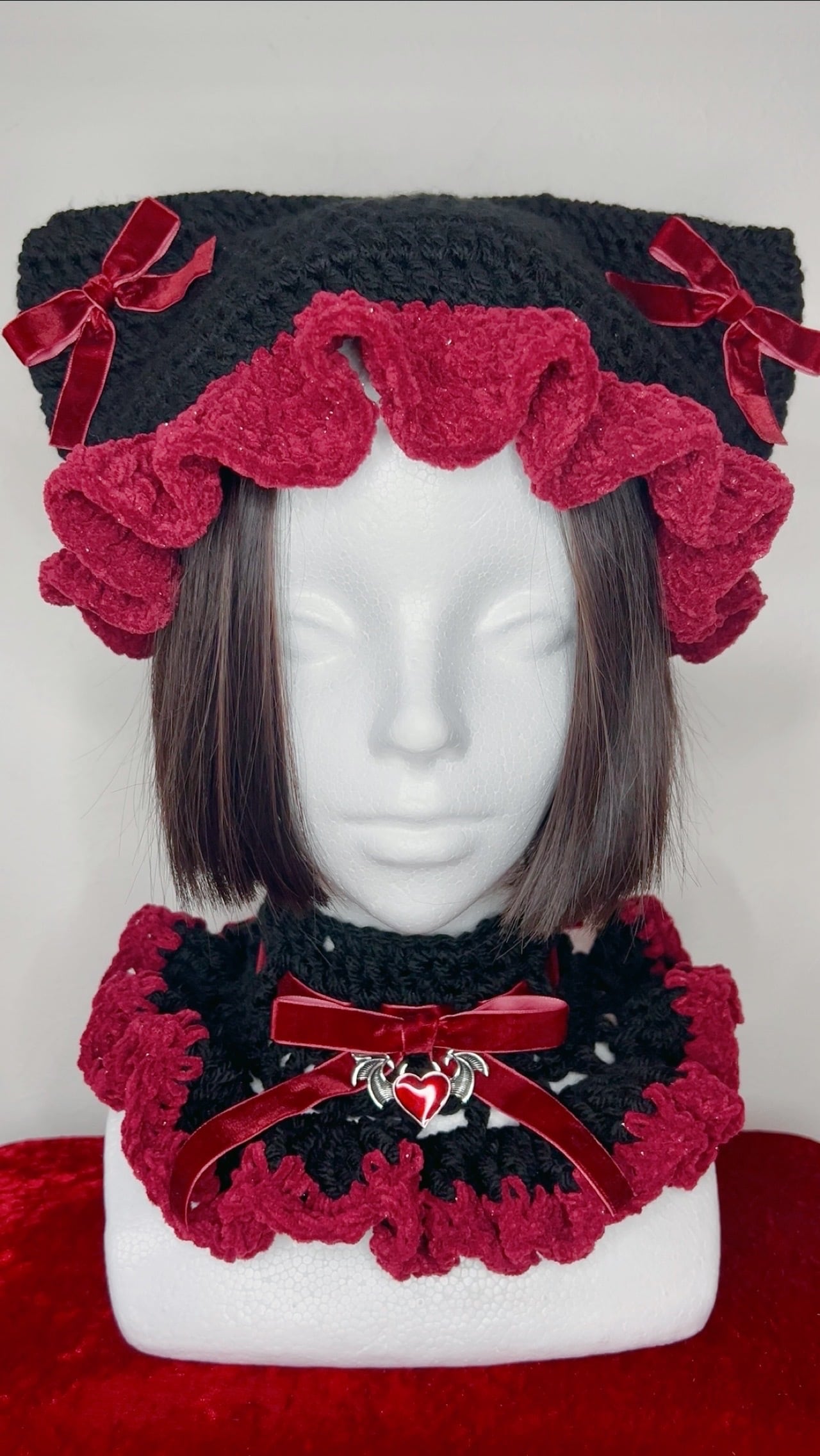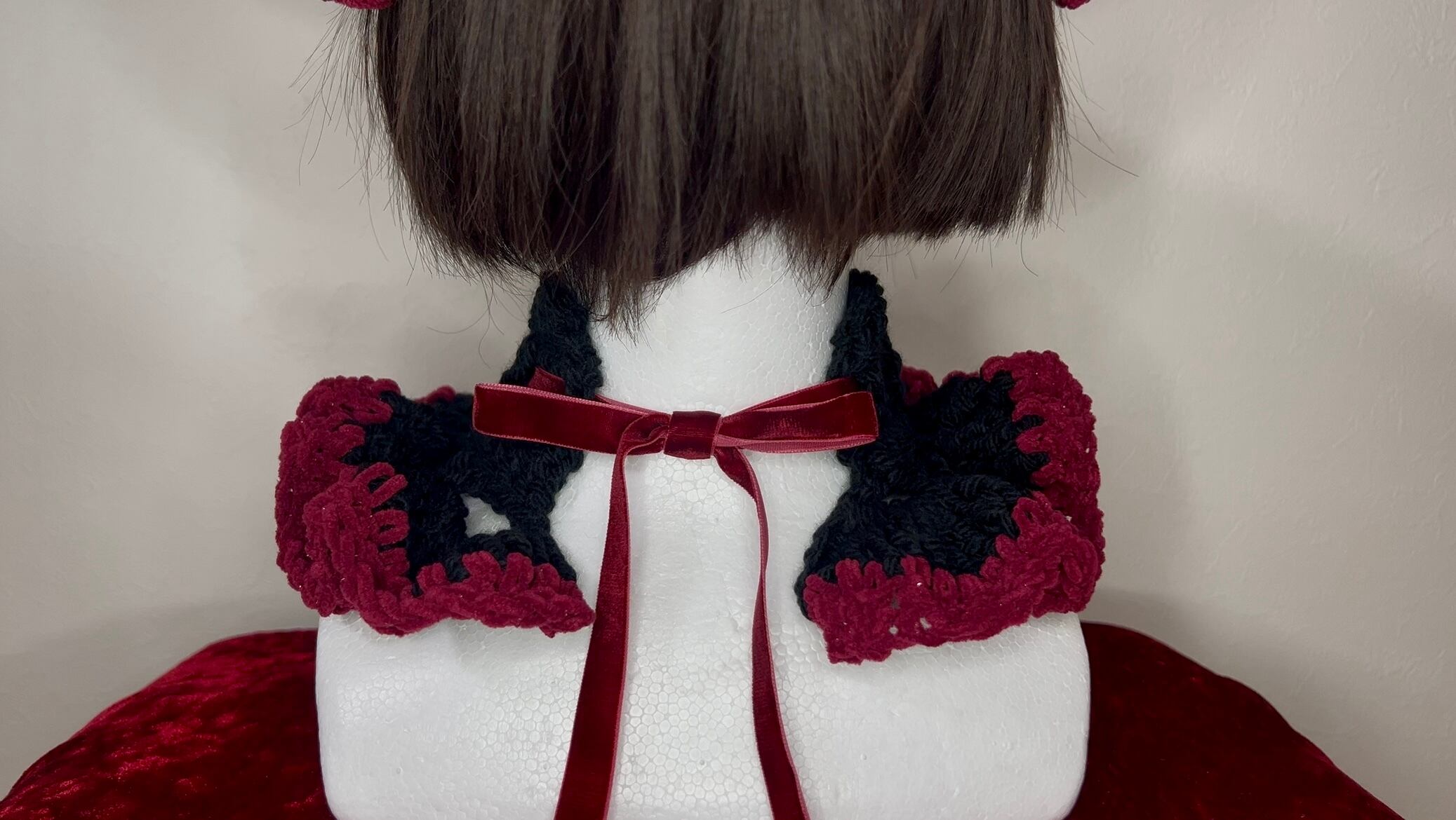 イカ耳ネコちゃんニット帽&チョーカー限定セット(黒×ボルドー)