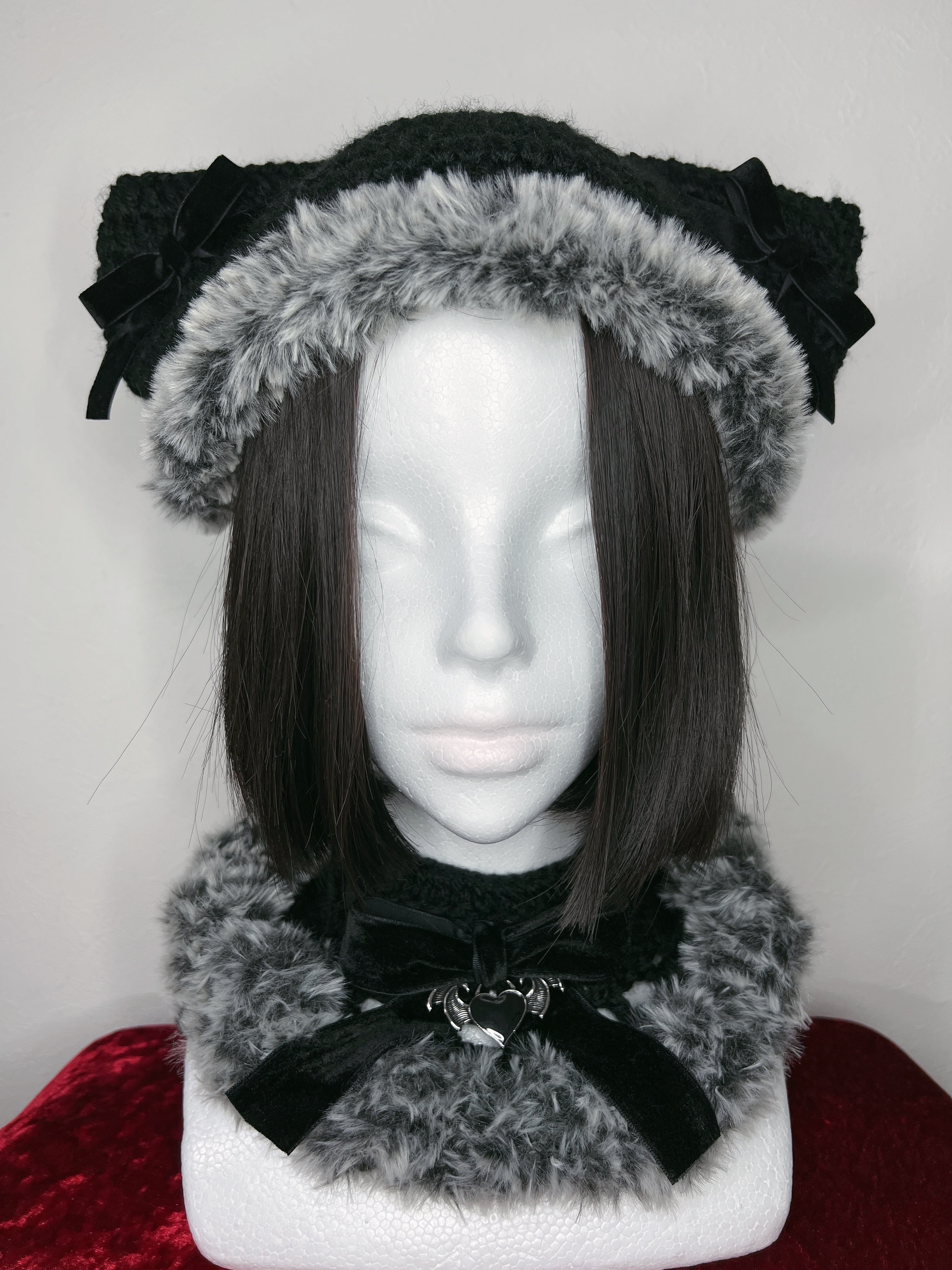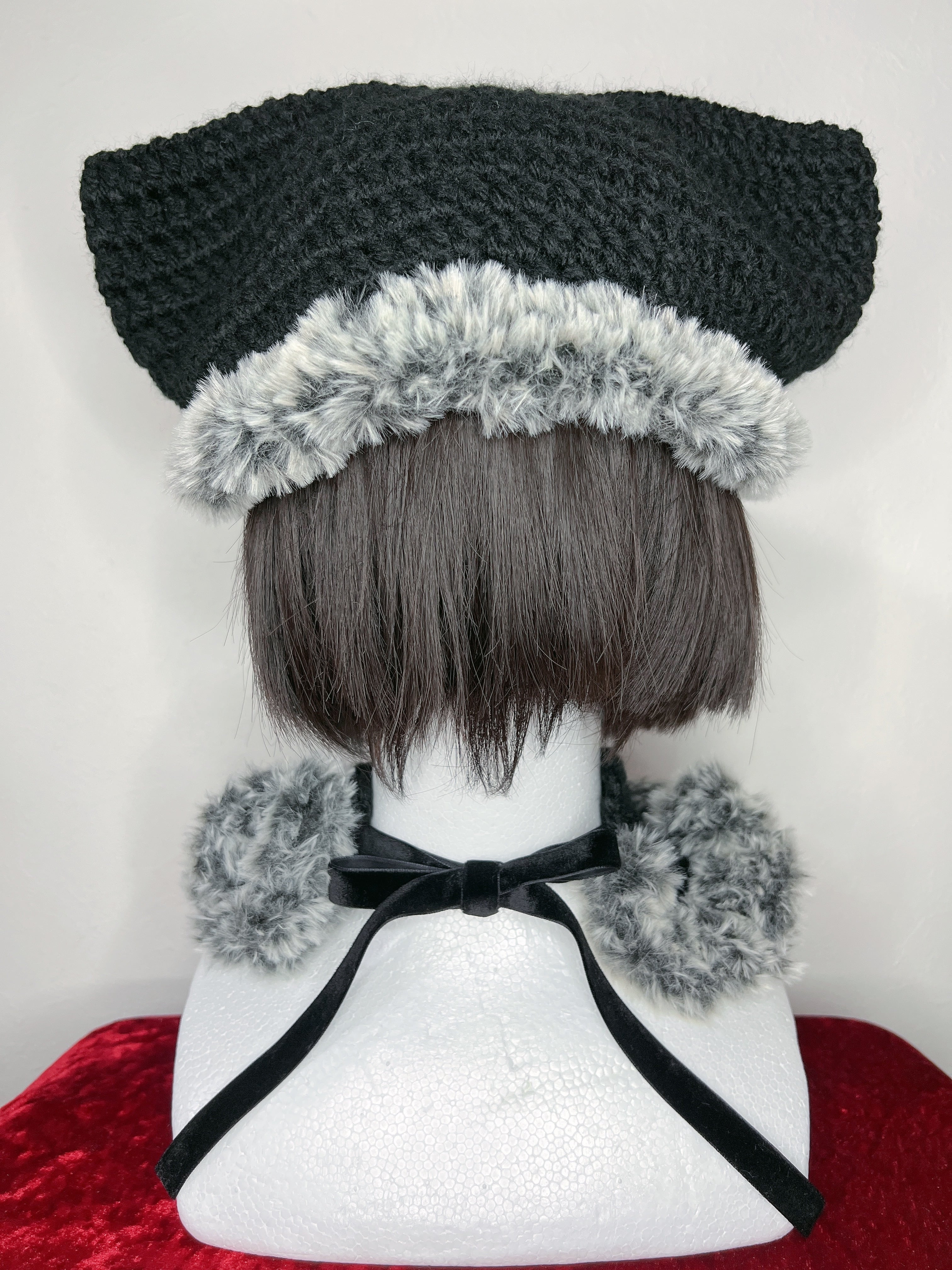 イカ耳ネコちゃんニット帽&チョーカー限定セット(黒×モフモフグレー)