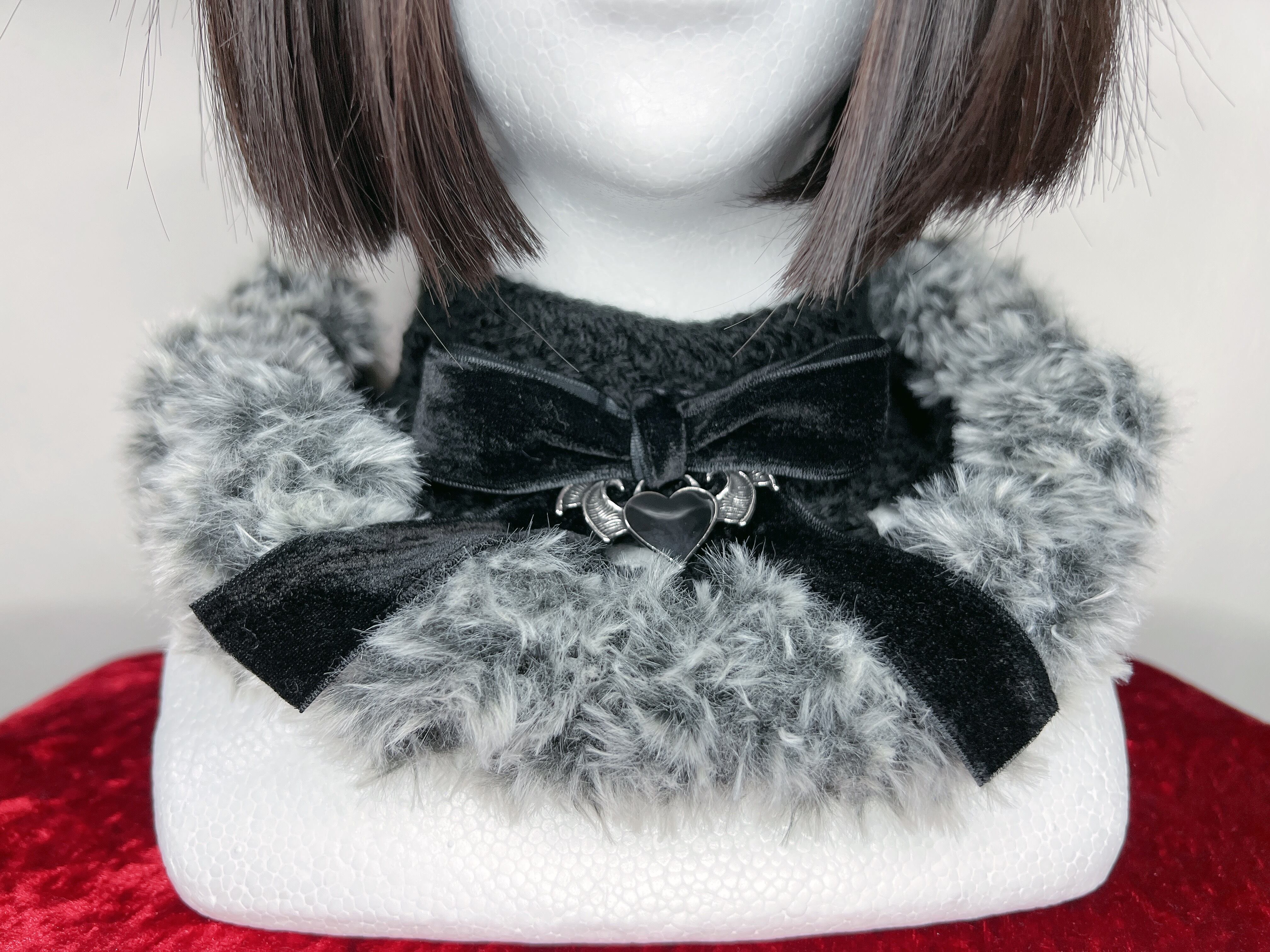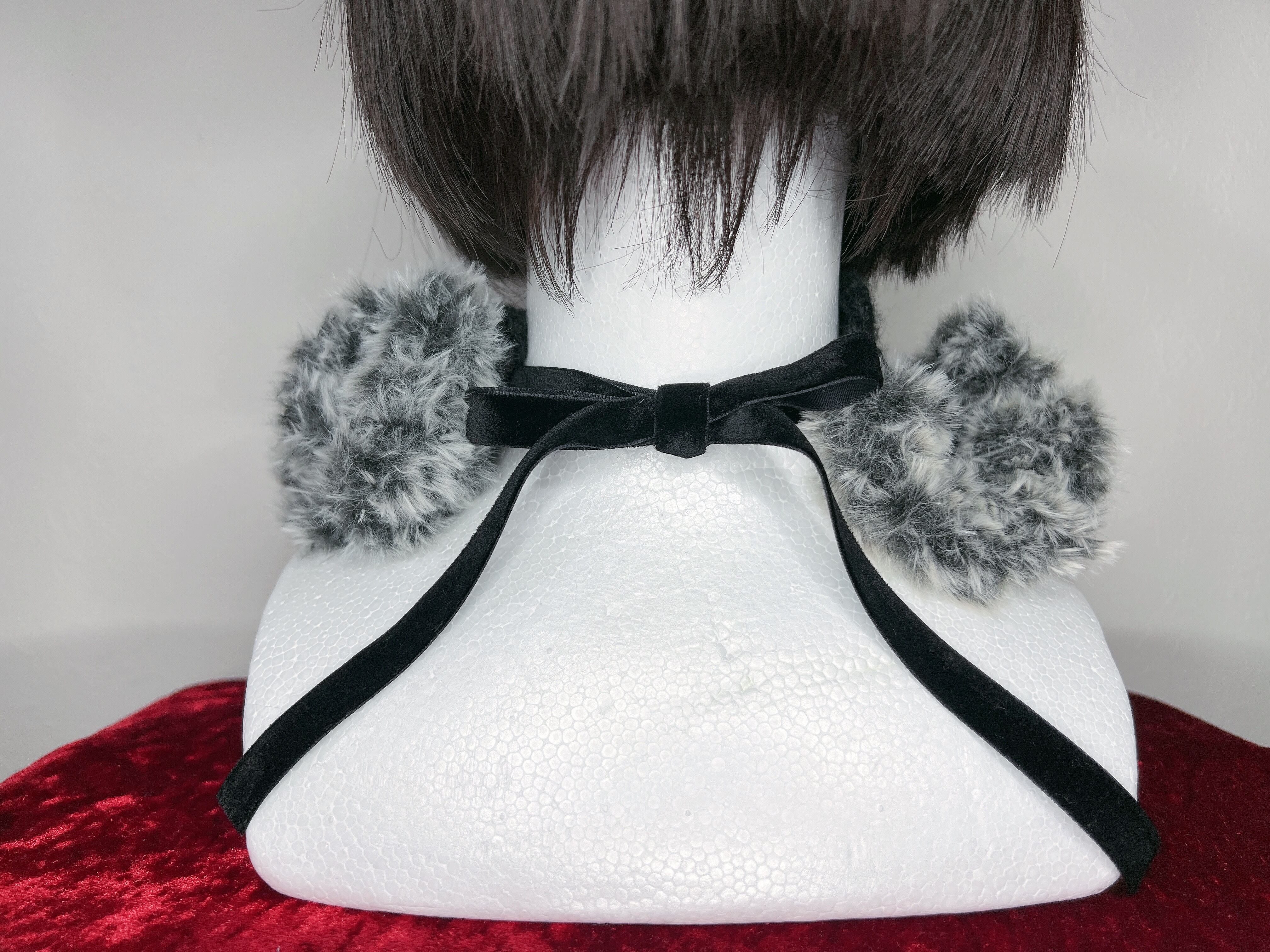 猫の毛のようなふわふわとしたファー素材を使用し、イカ耳ネコちゃんシルエットのニット帽とお揃いのチョーカーを仕立てました。