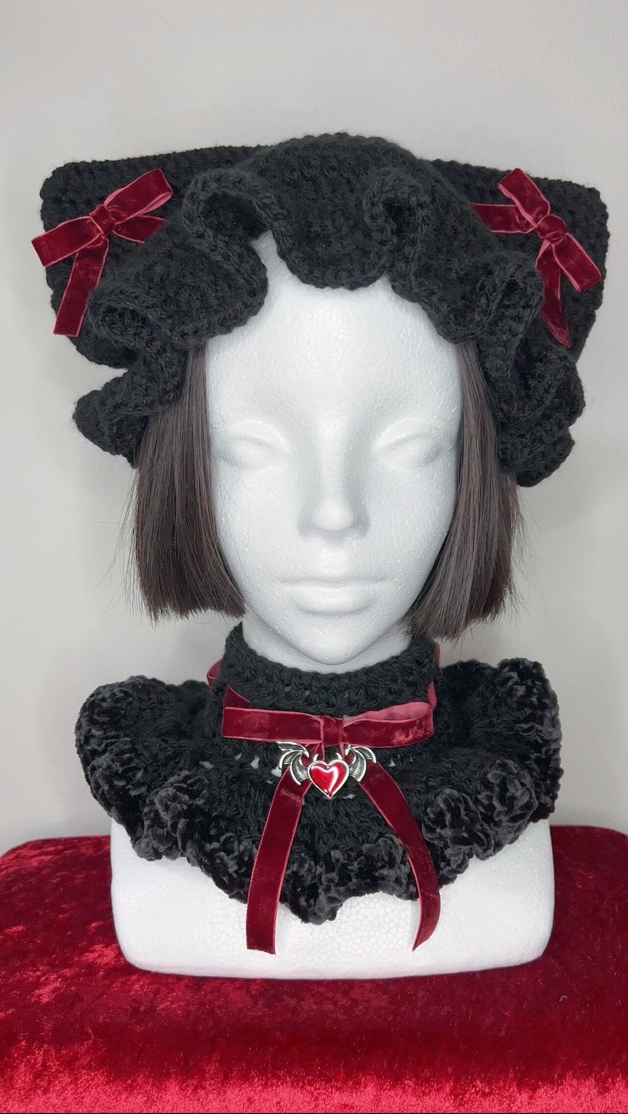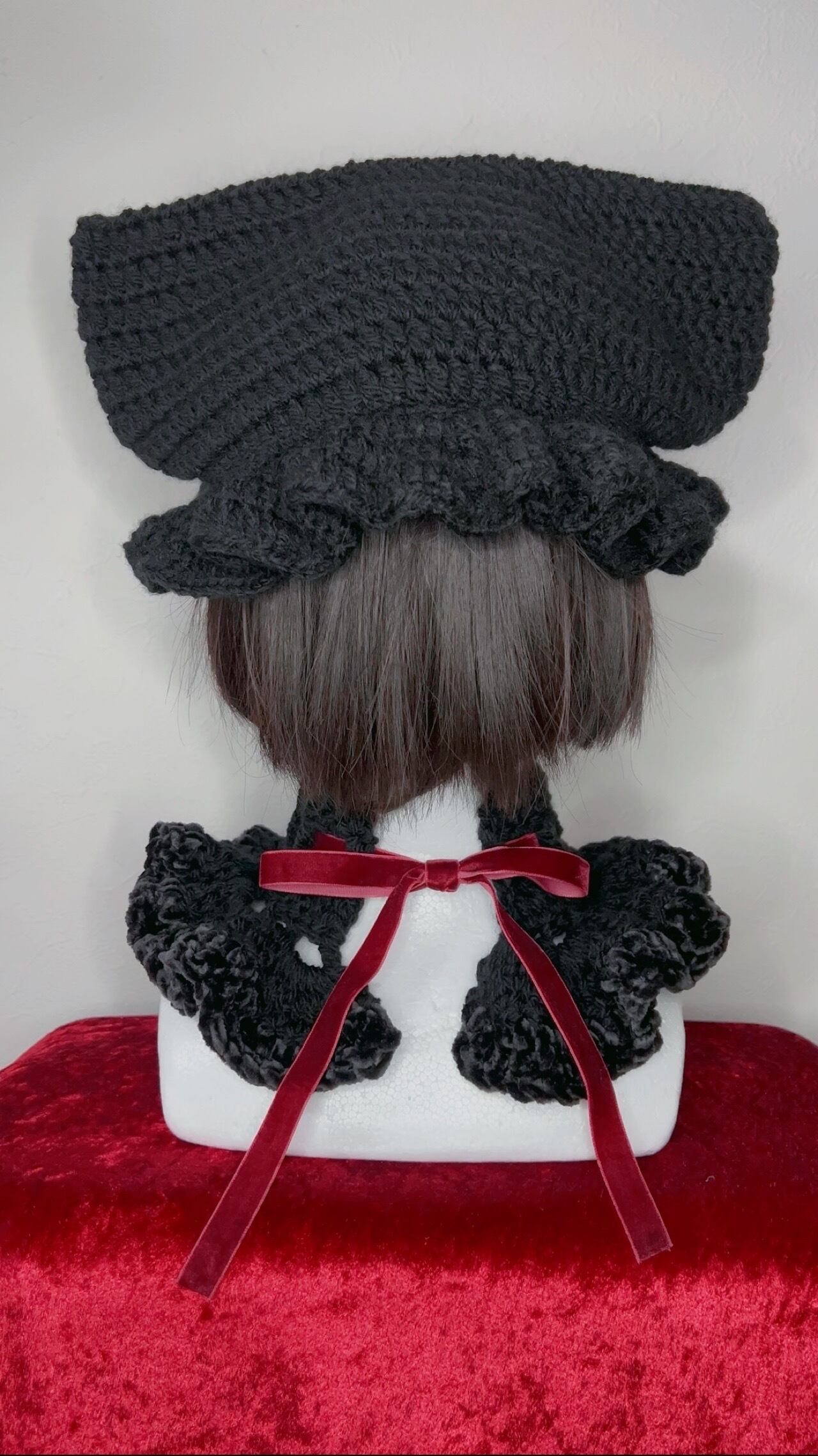 イカ耳ネコちゃんのニット帽&チョーカー限定セット(黒×黒)