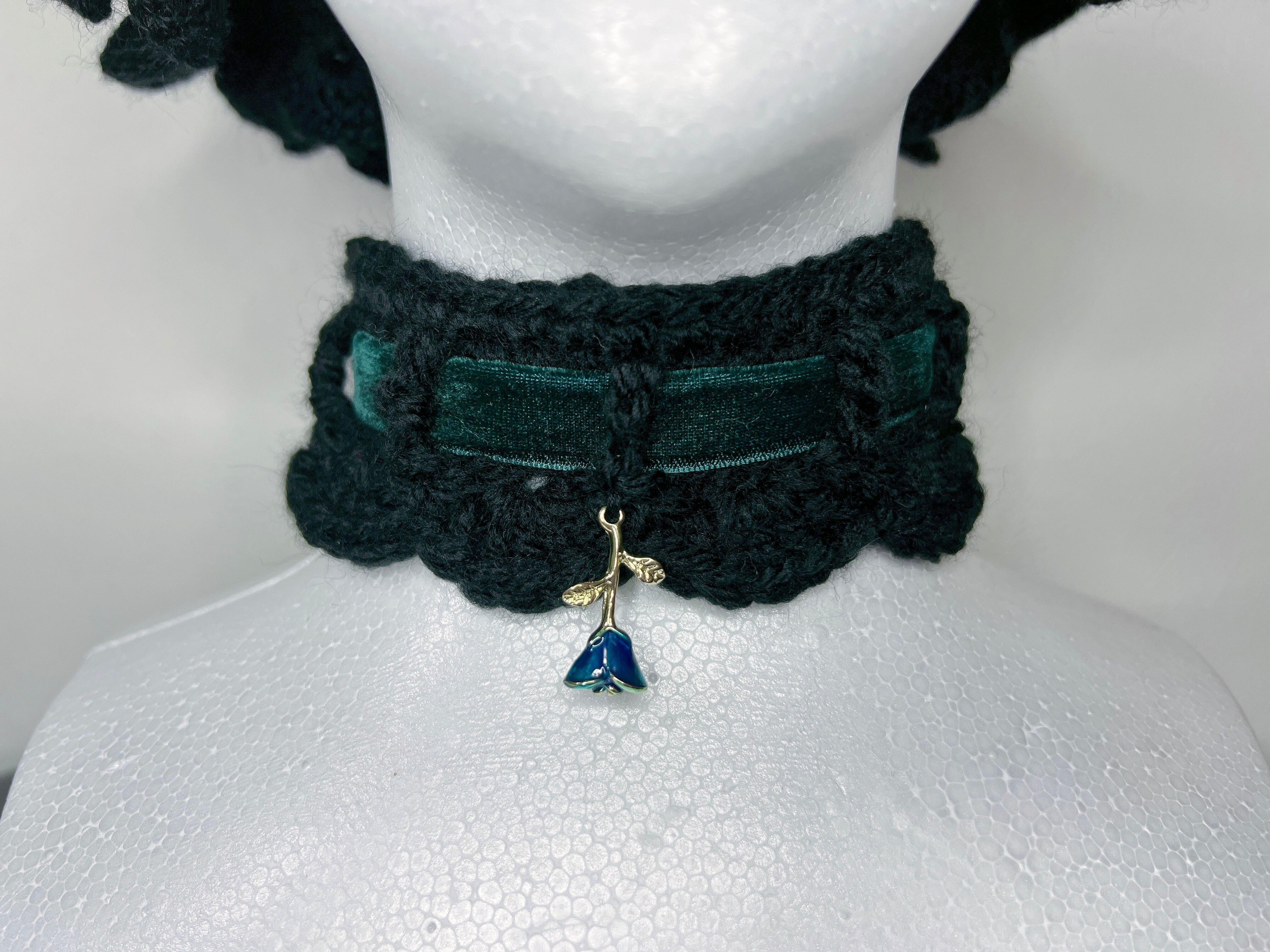 アクリル毛糸の柔らかな質感とベロアリボンに映える青い薔薇が背徳的なアクセントに。